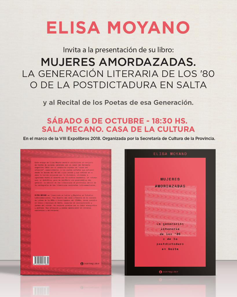 También se muestran fotos de presentaciones de libros individuales de Elisa Moyano como la de Mujeres amordazadas. La generación literaria de los ’80 o de la post-dictadura en Salta, ocurrida en Tucumán que tuvo como presentadoras a Liliana Massara y a Raquel Guzmán. La presentación salteña de ese libro fue un macro evento que contó con dos presentadoras Raquel Guzmán y Josefina Soria y un significativo grupo de escritores de aquellos años: Antonio Gutiérrez, Liliana Bellone, Marta Shwarz, Emilia Virginia Acosta, Belén Alemán, Raúl Rojas, Víctor Hugo Lellín (salteños, aparecen en la foto). También Marcelo Sutti, Pablo Baca (jujeño) y Manuel Martínez Novillo (tucumano) que aparecen en el video. Aparecen fotos de las cinco presentaciones del poemario El libro de las antepasadas: en el Abril Cultural salteño, en la Feria del libro de Buenos aires, en el Museo José Antonio Terry de Tilcara Provincia de Jujuy, en el Café Triumph de Villa San Lorenzo (2019) y finalmente una en el Congreso Nacional de Literatura Argentina en San Salvador de Jujuy en 2022.
